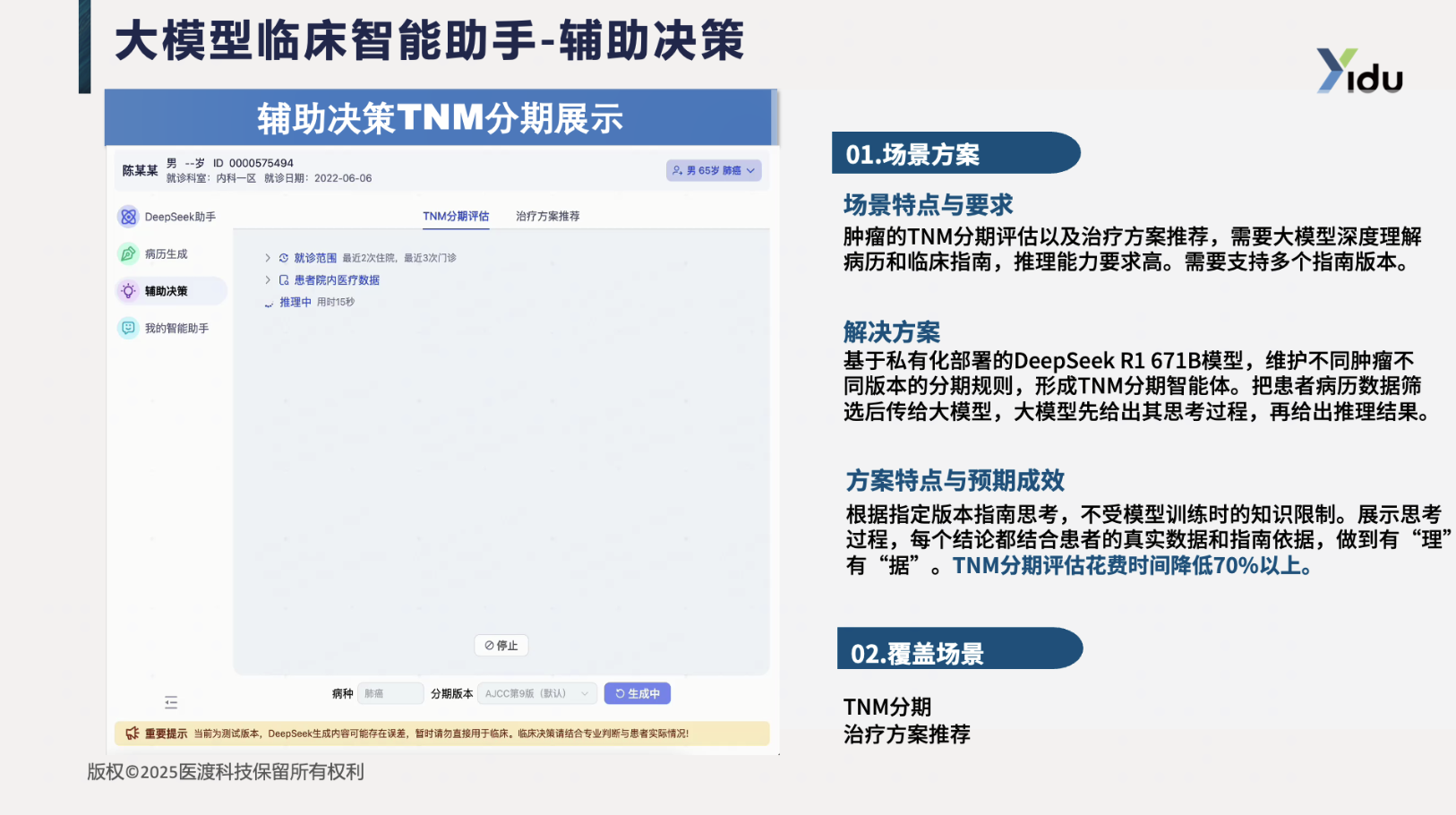 在智慧診療場景,醫(yī)渡科技的大模型臨床智能助手已在北京腫瘤醫(yī)院等機構落地應用,支持病歷生成、輔助決策等功能。以TNM 分期評估為例,大模型能結合患者病歷數(shù)據(jù)和最新指南,快速完成評估,將花費時間降低70%以上,且結果穩(wěn)定可靠。此外,醫(yī)生還可通過自定義工具,根據(jù)自身需求創(chuàng)建專屬智能體,滿足不同科室、不同場景的個性化需求。