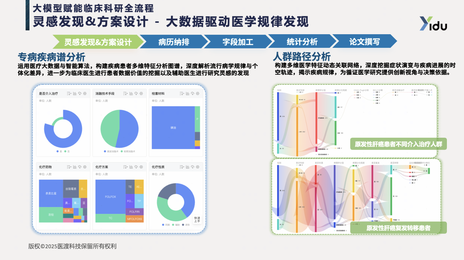 在臨床科研場景,醫(yī)渡科技基于專病數(shù)據(jù)庫,通過大模型賦能實現(xiàn)文獻驅動的靈感發(fā)現(xiàn)、數(shù)據(jù)驅動的規(guī)律挖掘,以及科研全流程自動化——從自然語言檢索病例、智能數(shù)據(jù)加工到統(tǒng)計分析、論文撰寫,大幅提升科研效率。