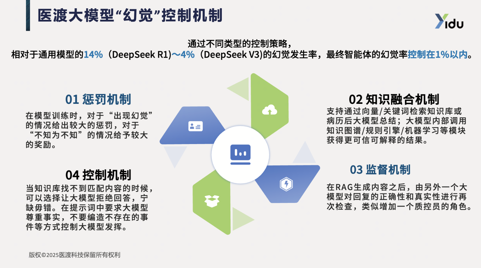 針對大模型幻覺問題,通過模型訓練優(yōu)化、知識融合增強、監(jiān)督機制完善及工程控制強化等多重手段,將幻覺發(fā)生率控制在1%以內(nèi),為醫(yī)療場景的廣泛應用奠定堅實基礎。