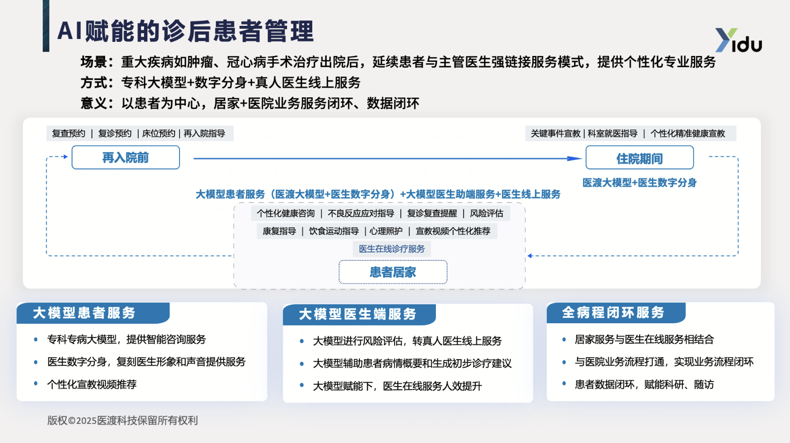 在智慧服務場景,大模型在診后患者管理場景的應用價值尤為凸顯。李林峰介紹,針對腫瘤、冠心病等重大疾病術后患者,醫(yī)渡科技通過??拼竽P徒Y合數(shù)字分身技術,為患者提供個性化健康咨詢、不良反應應對指導、復診復查提醒等服務,同時輔助醫(yī)生生成回復內(nèi)容,大幅提升了醫(yī)生工作效率。