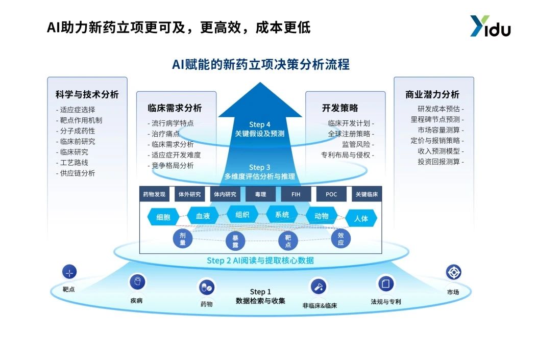 醫(yī)渡科技構(gòu)建了AI賦能的立項(xiàng)決策分析流程:首先,AI系統(tǒng)依目標(biāo)從靶點(diǎn)數(shù)據(jù)庫(kù)、疾病文獻(xiàn)等多源抓取數(shù)據(jù),保障全面準(zhǔn)確;其次,利用自然語(yǔ)言處理技術(shù)解析文獻(xiàn)、專利,提取并結(jié)構(gòu)化存儲(chǔ)關(guān)鍵信息;再者,進(jìn)一步融合科學(xué)、臨床、開發(fā)、商業(yè)多維度分析,構(gòu)建全面評(píng)估體系;最終基于前期分析生成關(guān)鍵假設(shè)與預(yù)測(cè)模擬,為決策提供科學(xué)依據(jù)。