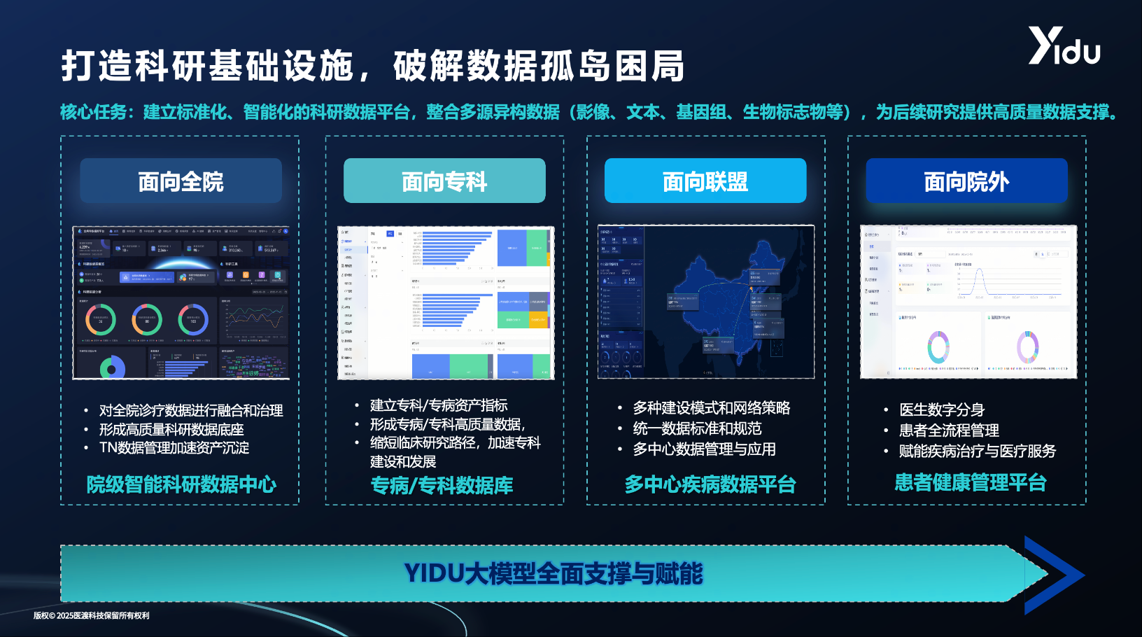 醫(yī)渡科技的科研創(chuàng)新不僅在于技術(shù)突破,更在于構(gòu)建了覆蓋“全院-???/span>-聯(lián)盟-院外”的智能科研生態(tài)體系。該體系從全院級數(shù)據(jù)中心到??贫ㄖ蒲芯柯窂剑瑥亩嘀行膮f(xié)同到臨床轉(zhuǎn)化延伸,在保障數(shù)據(jù)規(guī)范與安全的同時(shí),靈活滿足多元需求,大幅提升科研效率與質(zhì)量。